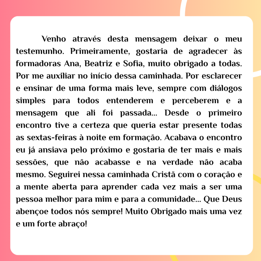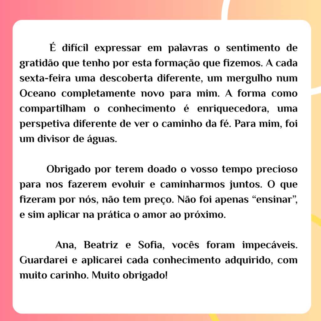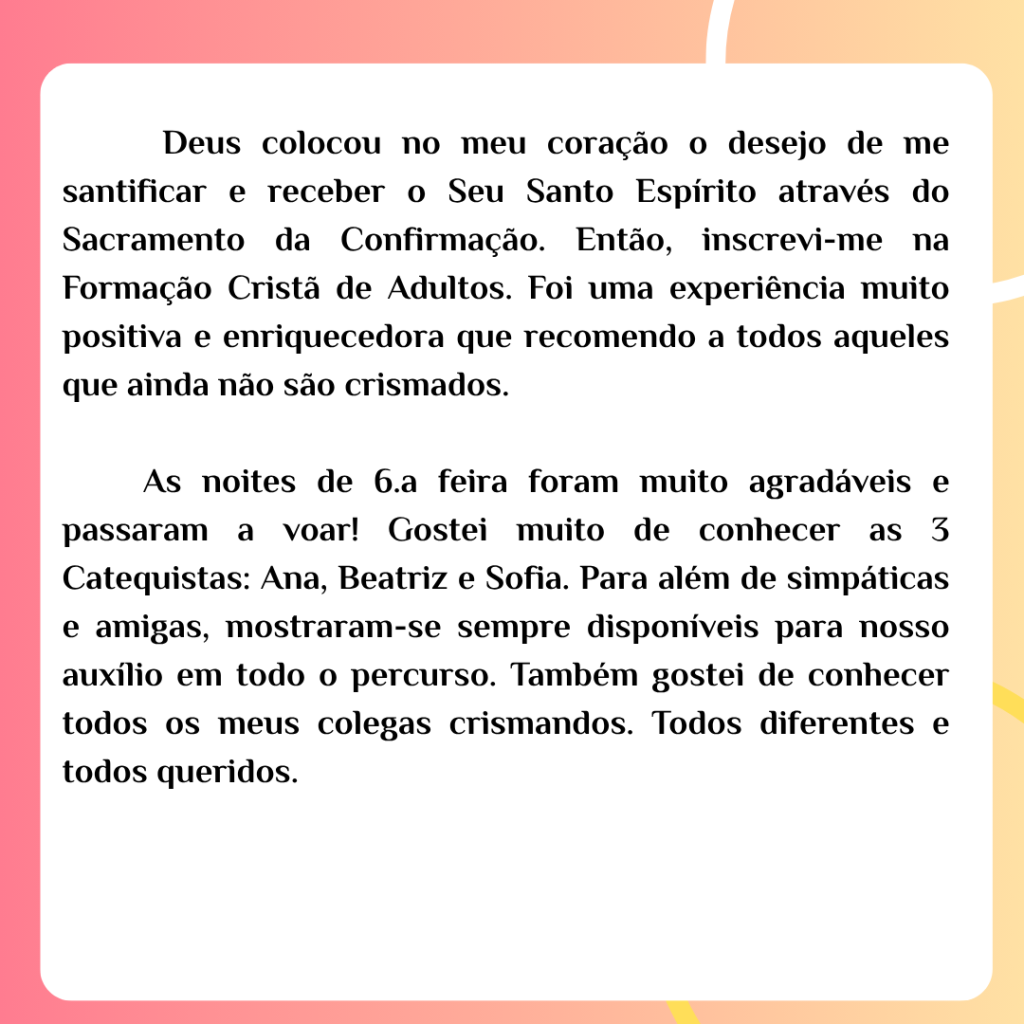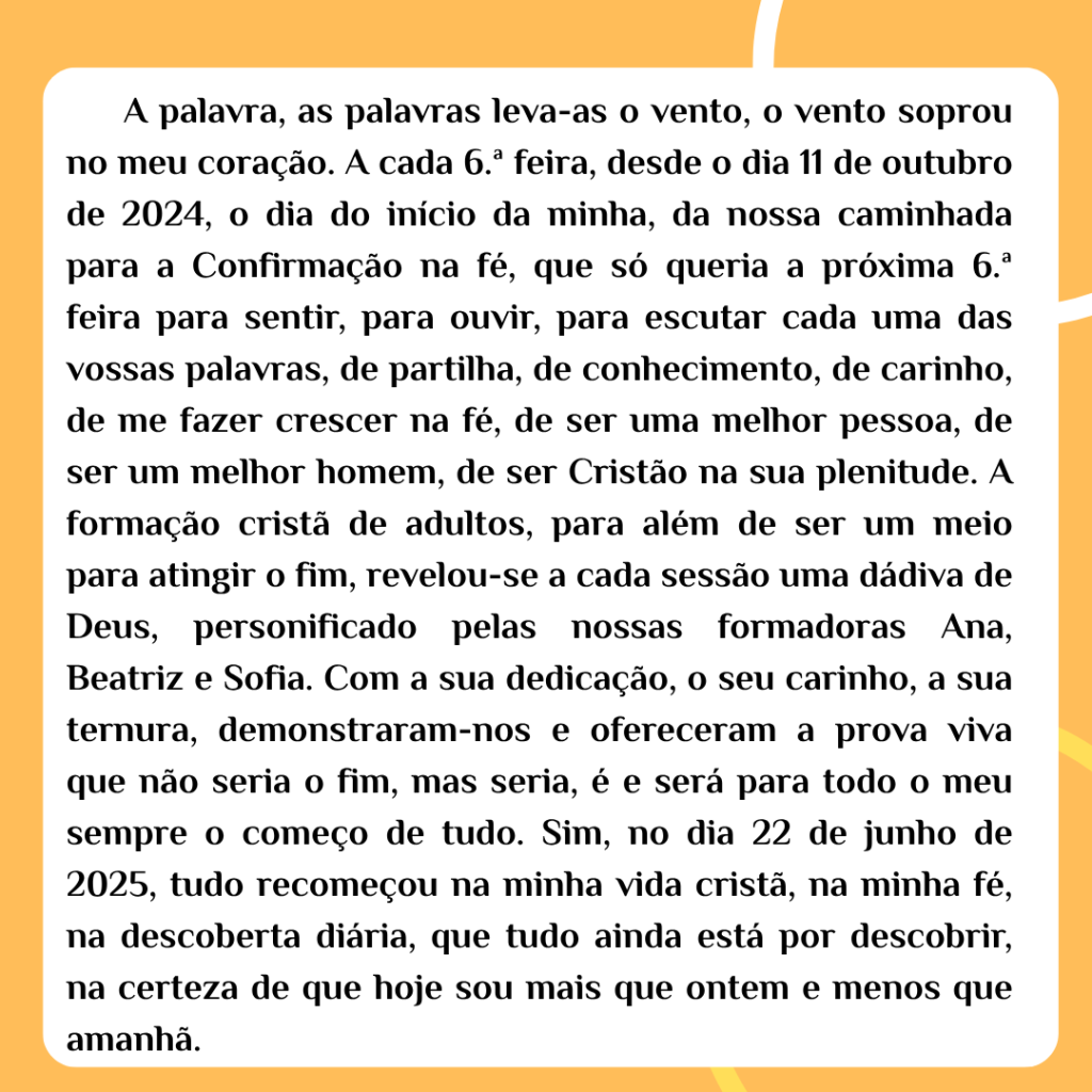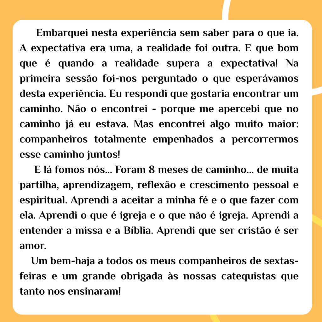 Enquanto estamos já a preparar o novo ano de formação, deixamos aqui registados os testemunhos da Joana, do Pedro, da Inês, do Douglas, do Caio e da Tânia, que fizeram connosco este percurso de educação e de partilha na fé. De outubro de 2024 a junho de 2025, às sextas-feiras, das 21h30 às 23h, na paróquia da Matriz (Póvoa de Varzim), estes jovens adultos fizeram parte de um grupo de treze elementos que foi fazendo o seu percurso na descoberta de um Deus que está sempre disponível para quem o quer acolher, construindo assim o início de uma fé adulta, pensada e experimentada, concreta, vivida em ações, participada no quotidiano e celebrada sempre em comunidade.