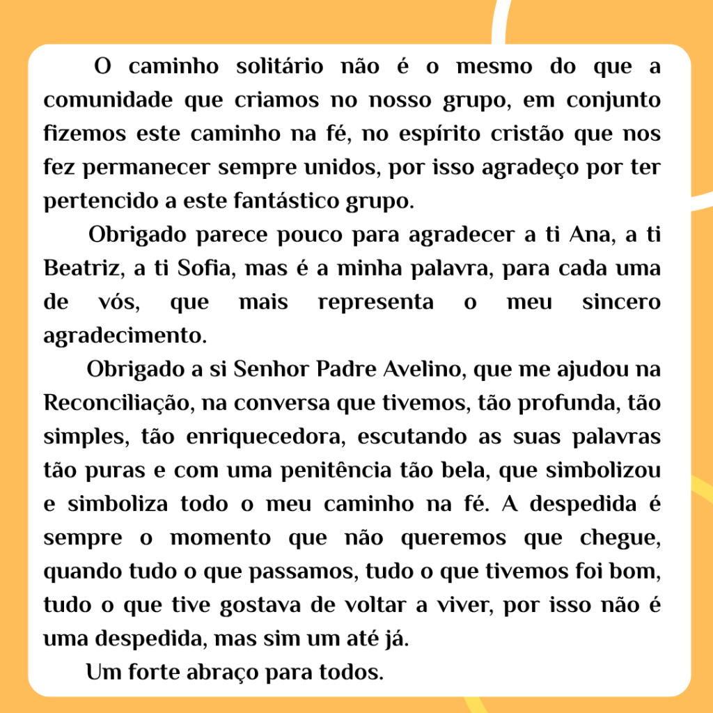 Um bem-haja a todo este grupo pelos momentos de partilha, de reflexão e de conhecimento e pela certeza que nos dão de que viver em Deus é, essencialmente, um viver com e para os outros.
