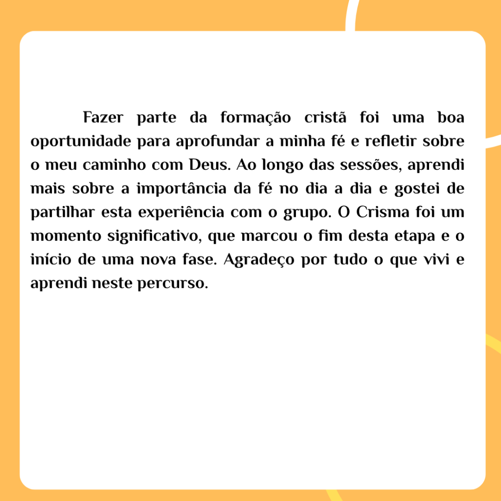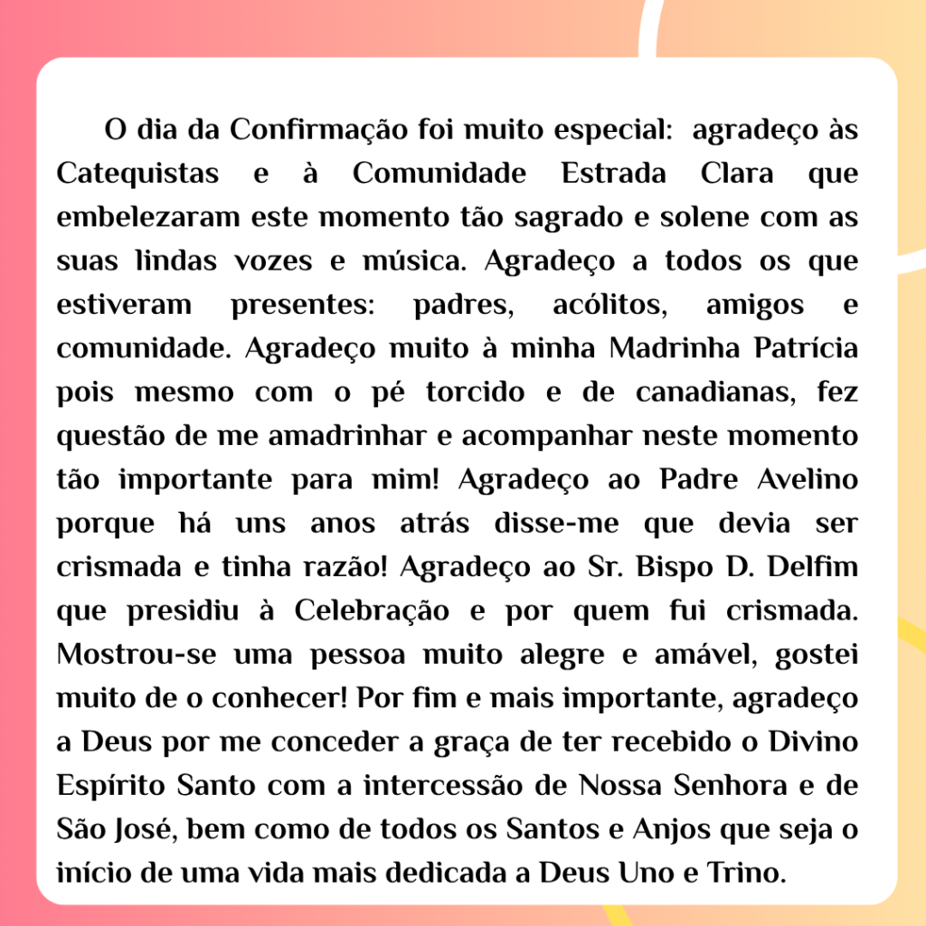O quarto grupo deste quarto ano de Formação Cristã de Adultos, promovida pela Paróquia Nossa Senhora da Conceição (Matriz) em parceria com a Comunidade Estrada Clara, culminou com a celebração do Crisma pelo Bispo Auxiliar de Braga, Dom Delfim Gomes, no dia 22 de junho de 2025, na Igreja Matriz. Recordamos, com imensa alegria e muita gratidão, esse dia festivo em que os nossos treze crismandos (a Anair, o Arthur, o Caio, a Carina, o Douglas, a Inês, a Joana, a Márcia, o Pedro, a Roseane, a Serafina, o Sérgio e a Tânia) receberam o Espírito Santo e foram fortalecidos com os seus dons. Lembramos também o percurso particular do Arthur e do Caio que, escolhendo, numa idade adulta, assumir uma vida cristã, receberam os sacramentos do Batismo e da Eucaristia. A Roseane também recebeu, pela primeira vez, a Eucaristia, um momento de imensa alegria para ela.