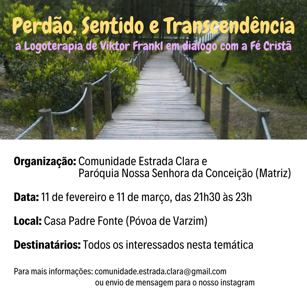 Por isso, continuamos neste nosso caminho comum e neste mês em que se assinalam três anos de encontros “Falar para CRER”, a Comunidade Estrada Clara, em colaboração com a Paróquia de Nossa Senhora da Conceição (Matriz), propõe um ciclo de formação, em dois momentos, que aborda a dimensão do perdão na vida humana. Partindo da Logoterapia de Viktor Frankl, que nos convida a descobrir um propósito mesmo nas situações de sofrimento, esta formação será vivida em diálogo com a mensagem cristã do perdão. O perdão não apaga a dor, mas pode transformar o coração, libertando-nos do peso do ressentimento e abrindo-nos à esperança e renovando o nosso propósito de vida. Ao longo destes dois encontros, seremos convidados a refletir, partilhar e meditar, descobrindo como o perdão pode tornar-se um verdadeiro caminho de liberdade interior, reconciliação e vida com sentido.